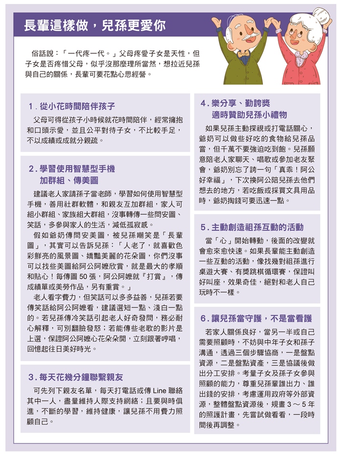 郭慈安前陣子花很多心力關注獨居老人或子女不在身邊的老夫婦家庭,鼓勵他們除了為自己寫生命故事,每天更要花幾分鐘做一件和支持網絡有關的事,例如把朋友親戚列個名單順序,每天打電話給其中一個人,盡量維持人際支持網絡。「既然老人交朋友很難,就把既有的維持住,新的則靠鼓勵大家出來參加活動,結交新朋友延緩智能喪失。」