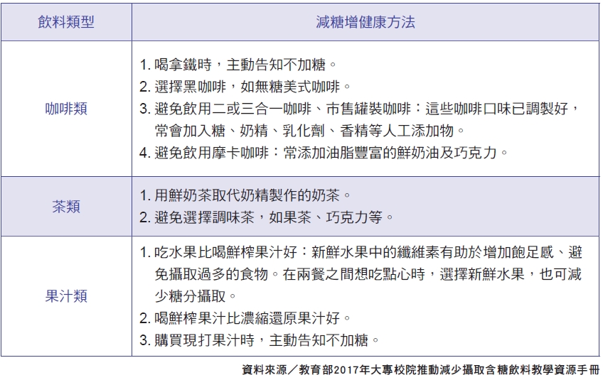 - 建議飲料口味越單純越好,少加配料:如珍珠、椰果、蒟蒻、粉條、布丁、咖啡凍、果凍、芋圓、冰淇淋、可可碎片、巧克力等。若真的要加,可選擇較低熱量的仙草、愛玉,如仙草茶、檸檬愛玉;或是紅豆湯、綠豆湯等全穀類為主的點心,但下一次正餐的澱粉量就得減少。