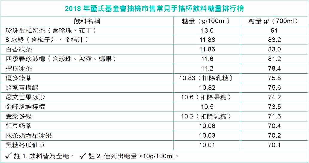 手搖杯飲料營業額逐年攀升,預估年營業額已突破600億元,購買手搖杯飲料已是多數人生活的一部分。而手搖杯飲料實際的含糖量和熱量為何?董氏基金會食品營養中心於2018年5~6月間,針對大臺北地區常見的連鎖手搖杯飲料店進行調查,共計調查18間連鎖飲料廠商、共31個據點,並根據熱銷品項隨機抽驗67款飲料的糖量及熱量,結果發現糖量、熱量都超驚人。