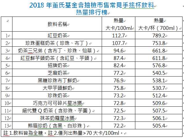 董氏基金會本次調查常見手搖杯飲料,並實際檢測後,列出糖量、熱量排行榜如下: