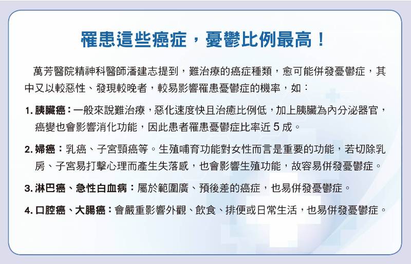 此外,口腔癌患者過去常把「香檳酒」(香菸、檳榔、酒)當成快樂泉源,除了罹癌後必須戒掉菸、檳榔、酒,手術治療也很容易造成破相,出門還得小心翼翼地戴口罩遮掩,不免憂鬱找上門。而胃癌、食道癌患者,連「吃」這個最原始的生活享受都被剝奪,許多病人甚至要用鼻胃管餵食,失去了基本尊嚴,憂鬱也容易趁虛而入。