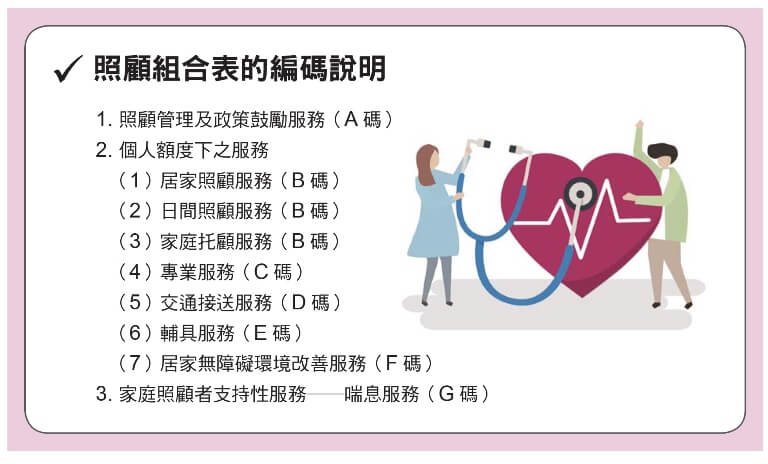 以長照需要等級是第七級的呂奶奶為例,對照「表一」可發現原本的「照顧及專業服務額度」,政府每個月可補助32,090元,但因為已請外籍看護,所以被限縮到只補助30%,也就是9627元左右,這9627元只能用於「專業服務」,例如:營養照護、復能照護等,至於屬於組合表中B碼的「照顧服務」,像是日間照顧、居家照顧服務等,則不能使用。