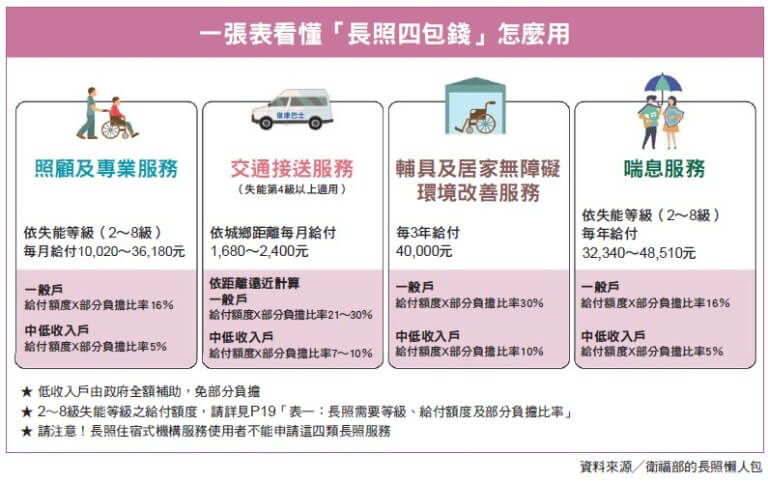 長照2.0自2018年起提供「長照四包錢」,分別為「照顧及專業服務」、「交通接送服務」、「輔具服務及居家無障礙環境改善服務」、「喘息服務」等四大項給付服務。民眾可撥打長照專線1966,或出院前向醫院洽詢「銜接長照2.0出院準備服務」,就有專人到府依失能程度(一至八級)或城鄉距離,評估補助額度。本文列舉兩個案例,教民眾如何利用「長照四包錢」,減輕家裡的經濟重擔!