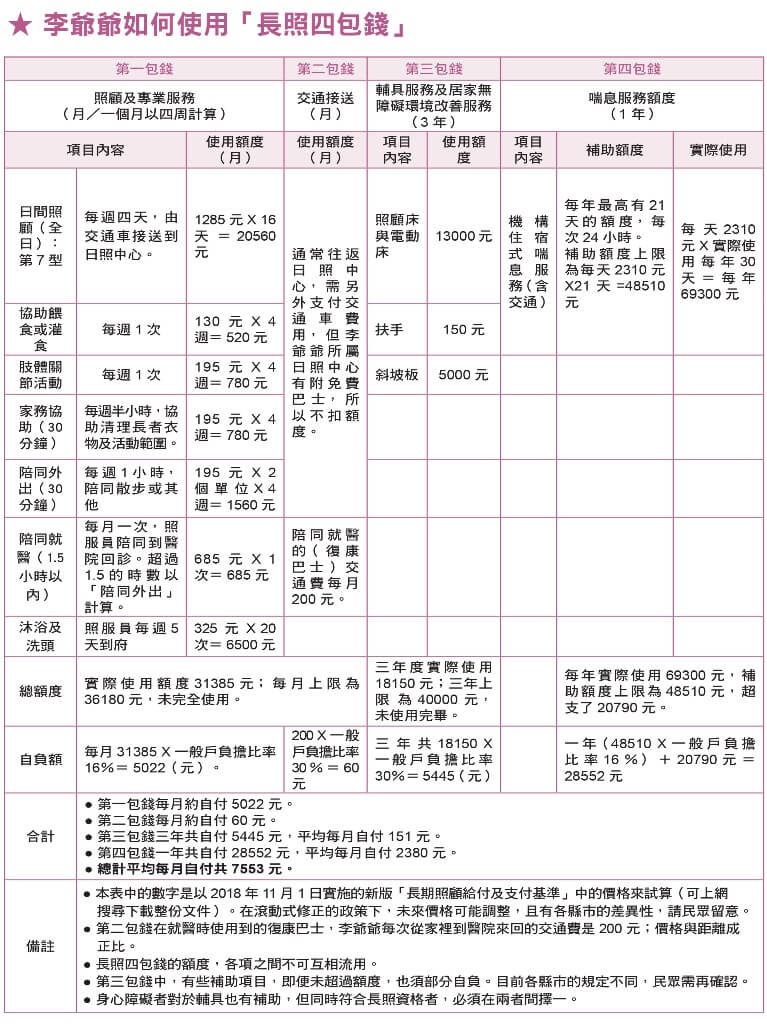 經濟負擔上,李家每個月平均只要花7000多元的費用,就可以妥善安排李爺爺的生活。經過日照中心訓練,現在李爺爺的失能速度減緩了,李家人不必常苦惱、吵架,可用比較自在的態度來面對李爺爺的老化。以下,讓我們來看看李家人是如何使用「長照四包錢」。