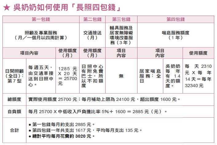 因為五天都在日照中心,居家的服務需求並不多,只是有時候會使用到第四包錢──喘息服務中的居家喘息,所以她的計算方式相對簡單。