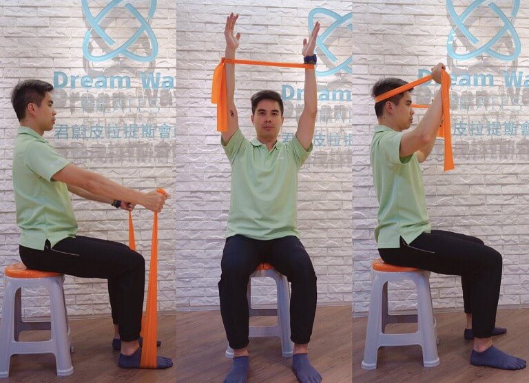 4. 身體不動,雙手維持把彈力帶向外撐開的姿勢,慢慢把手向上抬至頭頂上方,停留一個吸吐後再回到起始位置。