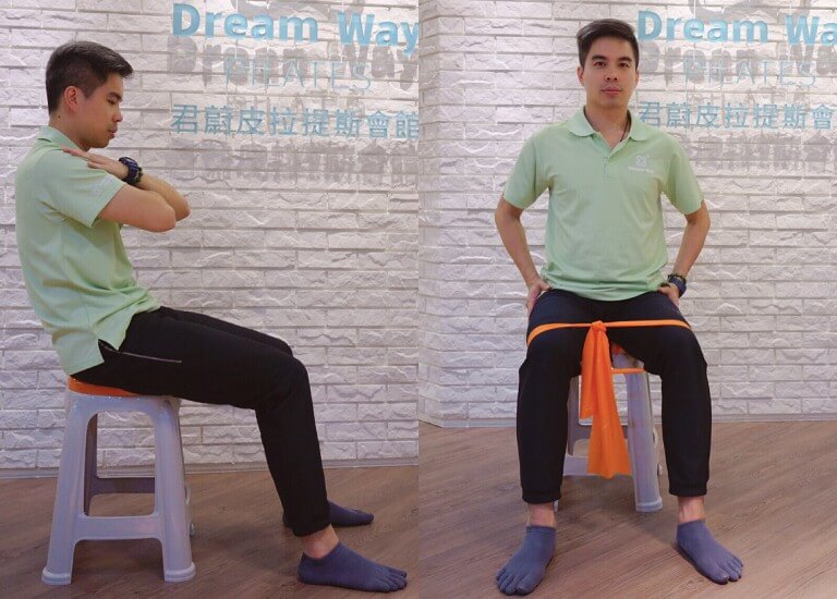 1. 坐在椅子上,把彈力帶綁在大腿上打個圈圈(彈力帶要把兩隻腳套住),雙手放在髖部(大腿根部)外側。