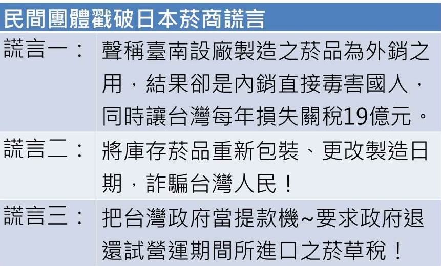 日本菸商臺南成功闖關設廠,並於2016年7月取得營運製造許可。當初日本菸商為了在臺南設廠表示菸品將全部外銷,但結果是內銷毒害國人!更不可思議的是,每年在臺超過700億元營業額的日本菸商還竄改菸盒上的有效日期,詐騙國人,甚至把臺灣政府當提款機,迫使財政部退還其聲稱2016年試營運期間繳交的1300萬元菸草稅!