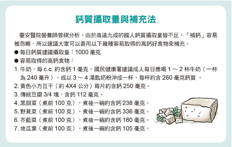 夏子雯營養師說,鈣質雖然是骨頭的原料,但從「攝取」含鈣食物到「合成骨質」之間,還有吸收率跟合成率的問題;為了讓效率更好,還要多攝取含維生素D的食物,並加上阻力、負重運動。