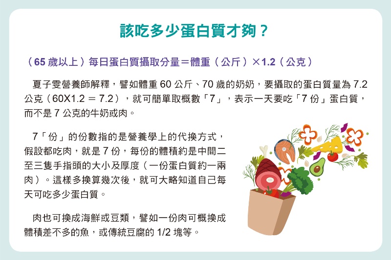 除了腎臟功能已經有問題的人以外,一般腎臟功能正常的老年人,對蛋白質的需求量要更多,而不是更少。夏子雯營養師提醒,每天的蛋白質量應均分在三餐中,吸收率才好!很多家庭是到了晚餐才家人同聚一堂,於是晚餐最豐盛,早、午餐的蛋白質都不夠,以為蛋白質可以在晚上一次補回來;其實一餐中多餘的蛋白質無法被身體有效率地吸收,多餘的熱量也會轉換成脂肪來儲存。