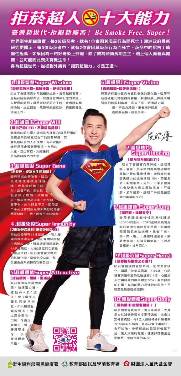 過去傳統拒菸宣導多以「菸害」為主題,但同學因為年輕較難體會菸品對身體的危害,為此衛福部、教育部及董氏基金會合作推出「拒菸超人」布條、海報、傳單,正向鼓勵學生向「拒菸超人」看齊,一起展現超級的智慧、意志、基因、顏值、眼力、聽力、鐵肺、心臟、免疫、體格等「十大超能力」。
