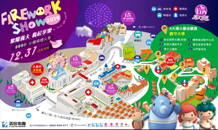 今年煙火將於12/31晚上23:59分以特效煙火揭開序幕,與民眾齊心倒數10秒,接著於午夜12點施放999秒3D藝術煙火秀,慶祝2019年的到來。結合科技與工藝,除了打造獨家的矩陣煙火,去年就頗受好評的360度煙火也推出2.0版本,今年透過轉動式發射,煙火的螺旋狀效果將升級出立體感,如同時空漩渦一樣,讓人目不暇給,搭配大型藝術燈光的多彩變化,打造一場奇想、歡樂、浪漫的跨年活動,希望為每一位參與的民眾都能在義大世界有著難忘的幸福與感動。