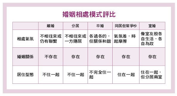 而「室婚」則仍住在一起,但是分房各自生活,家事分工合作,支出也公平分攤,但互不干涉,平日孩子回家,有父母可以喊,等孩子結婚後,再思考是否分開或一方搬到子女家去照顧孫兒。「通常到了這時候,兩人已習慣這種各自為政的相處模式,離不離婚已經無所謂了。」