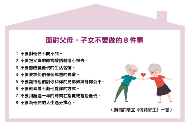《如果父母老後難相處》一書指出,美國專業高齡照護組織「暮光服務網」統計,前來尋求照護諮商的成年子女當中,為難以相處的父母而感到焦慮的比例超過50%。《如果我的父母是控制狂》一書也提到,根據統計,美國每13個成人之中,就有一個在「不健康的控制」之下長大。所謂不健康的控制,可能是父母試圖操控子女的飲食、穿著、言談、金錢、個人感受、人生選擇或社交生活。雖然國內目前沒有相關統計,但顯然成年子女為了父母企圖操控或過度依賴而感到有壓力的情形,並不罕見。