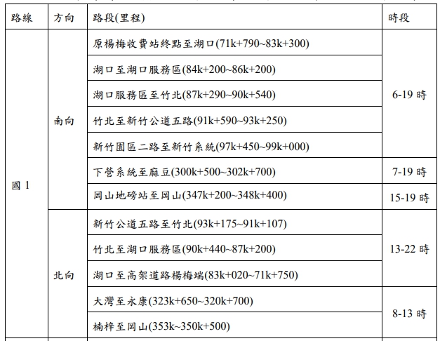 ►13至18時,實施國1高雄端至湖口、國3九如至大溪路段,各交流道之北向入口匝道高乘載管制。