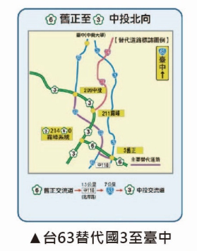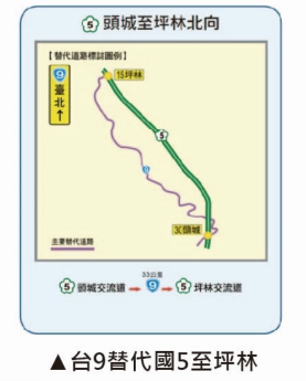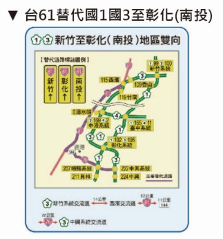 國道主線壅塞時,建議用路人改駛替代道路,避免塞在國道車陣,呼籲利用國5轉換台9、國1國3轉換台61、國6轉換台63,省時免塞車;另地區短程民眾多利用省道,不必上國道塞車。