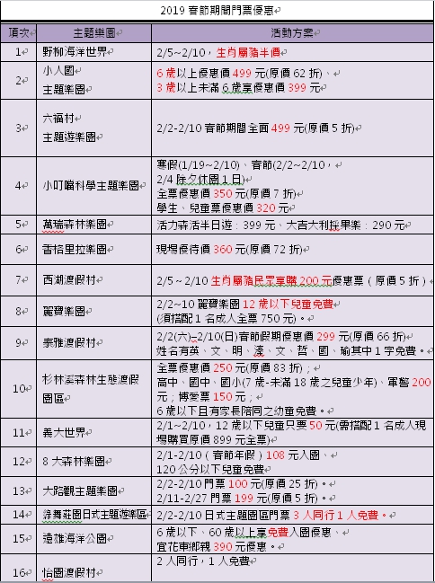 2019年過年連假九天,除了到親友家走春拜年,不妨也和家人朋友到戶外走走吧!本篇為你整理全台各大樂園的門票優惠、園區活動等,為你介紹六福村、小叮噹遊樂區、小人國、麗寶樂園、九族文化村、劍湖山世界、義大世界等春節優惠,還有屬豬民眾可以半價入園唷!讓你春節國內旅遊也能玩得開心。