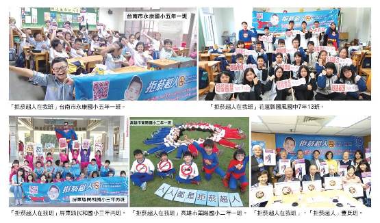 同時更舉辦全國校園「拒菸超人在我班」臉書PO班級創意照的PK活動,最後共收到來自429所學校、1,385個班級、33,323萬名同學,全班創意合拍表態拒菸。