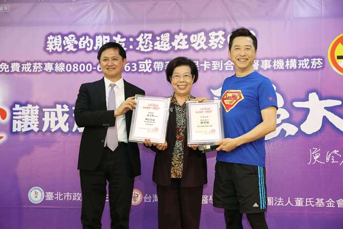 監察院張博雅院長(中)代表民間團體致贈感謝狀予公益支持「戒菸超人」活動的和碩集團童子賢董事長(左)以及公益代言的義工哈林庾澄慶(右)。