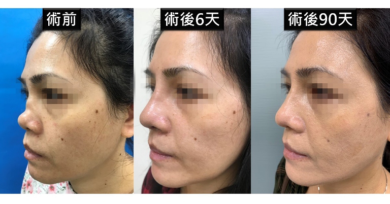 手術耗時約4.5小時,傷口除了胸壁上不到3公分的傷口外,鼻部手術也僅留下鼻頭下方(鼻小柱)的縫線,開刀次日鼻部會有些許腫脹感,住院觀察一天後即可出院。且手術胸壁處傷口不需拆線,只要在術後一週返院拆除鼻小柱切口的縫線即可。