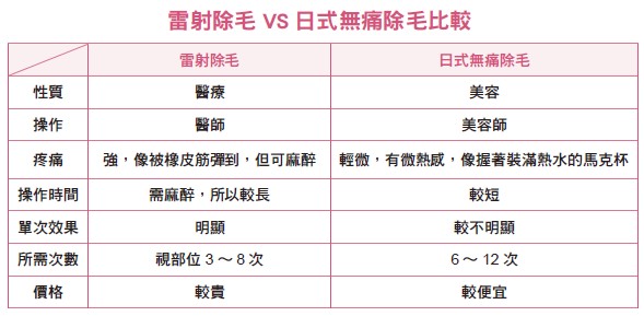 所以,如果超怕痛、希望有除毛效果,但不求快速,可以考慮日式除毛。如果願意花錢,可以接受一些疼痛,希望效果好、速度快,就考慮雷射除毛。