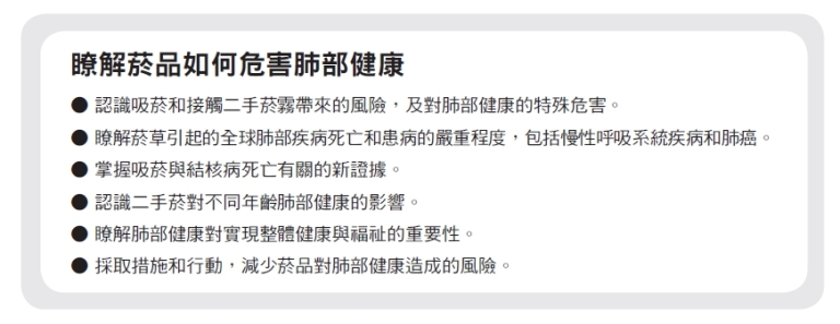 要實現肺部健康,必須瞭解吸菸產生的二手菸霧對全球吸菸者與非吸菸者的肺部健康都具有重大影響。世界衛生組織訂定「永續發展目標」──預計2030年將慢性非傳染性疾病導致的死亡率減少1/3,各國政府必須將菸害防制列為優先事項,且應通過全面實施《世界衛生組織菸草控制框架公約》,並採取最高標的MPOWER措施來對抗菸品盛行。