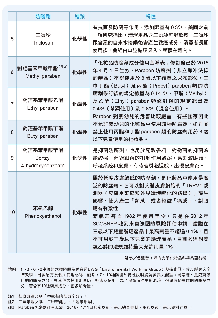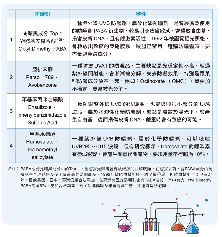 防曬品是由多種成分研製而成的產品,帛琉及夏威夷洲禁售、禁用的防曬乳是基於保護海洋生態,但不代表沒有禁售、禁用的合格成分就屬於安全成分。長期研究化妝品的吳姵萱副教授提出四大暗黑成分供讀者參考,挑選防曬品時,一定要詳閱成分標示,避免損傷健康。