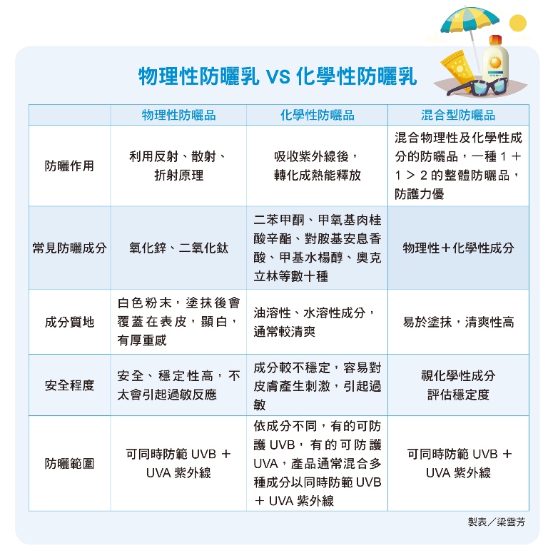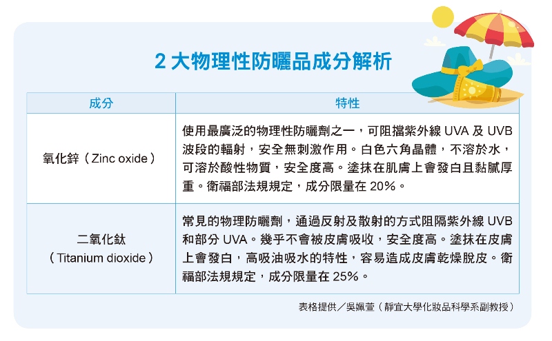 靜宜大學化妝品科學系副教授吳姵萱表示,防曬品的成分中,只有氧化鋅(Zinc oxide)及二氧化鈦(Titanium dioxide)二種是物理性,其他則以化學性居多,高達數十種。雖然一般會將防曬品分為物理性及化學性,但市售防曬品八成以上都是混合型,就是試圖在兩類擁有優缺點的成分之間,找到能降低風險、維護健康、保護生態安全、容易使用等多重面向的平衡點,所以挑選時應重視「整體配方」概念,既有防曬效果,又能符合安全要求。
