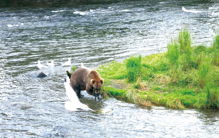 【圖說3】透過本書「輯一」精彩的旅行紀實,我彷彿進入紙本的國家地理頻道,得以一窺位於阿拉斯加半島北部的棕熊抓鮭魚時,「撿便宜」的水鳥來搶食魚肉的驚險瞬間,以及藍天碧水相映的育空河。