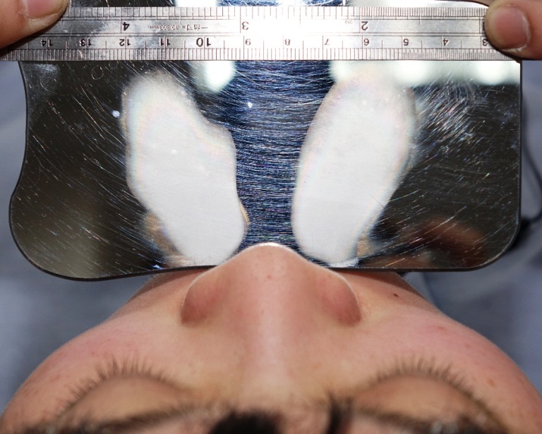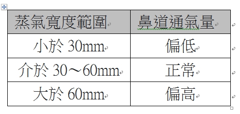 【方法一】鏡面蒸氣範圍記錄:孩子坐著時,檢測鼻子吐氣到鏡面上的蒸氣暈,標記出蒸氣的範圍,至少需要進行兩次測試。(請參考下圖)