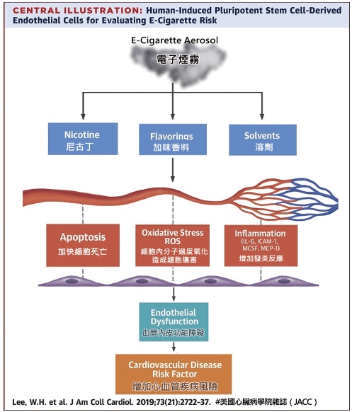 美國史丹福大學研究指出,電子煙霧中的有害化學物質會加快血管中的細胞死亡、增加細胞內過氧化壓力,及增加發炎反應與不良發炎物質的堆積等,進而對心血管內皮造成傷害,增加心血管疾病的風險。研究結果顯示,電子煙內含有調味劑,即使沒有尼古丁等有毒物質,卻依然可能引發血管功能障礙,進而增加心臟疾病風險,尤其是肉桂和薄荷傷害最大!研究人員指出,這項研究清楚地表明,電子煙不是傳統紙菸的安全替代品,且電子煙具有欺騙性,吸食者在短時間內,根本不知道自己暴露在比傳統紙菸更高含量的尼古丁中。