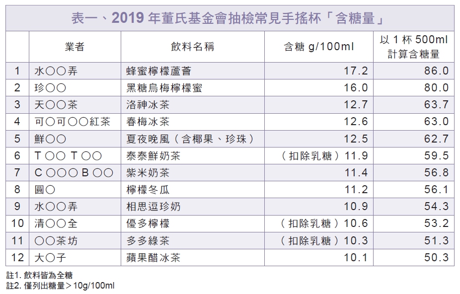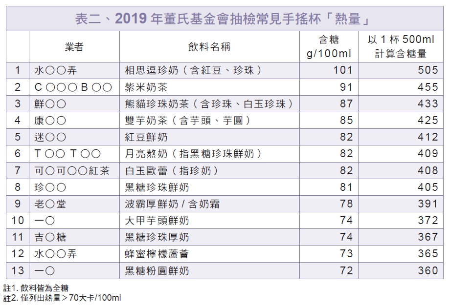 董氏基金會食品營養中心於2019年1~3月間,針對大臺北地區常見連鎖手搖杯飲料店進行調查,共調查22間連鎖手搖杯品牌、共55間販售分店,並根據熱銷品項隨機抽檢169款飲料的糖量及熱量,發現手搖杯含糖量依然驚人!