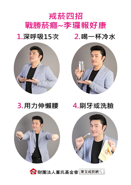 董氏基金會表示,世界衛生組織最新報告強調,沒有科學的證據證明新興菸品可以幫助戒菸!想戒菸的朋友可以拿著健保卡至全國各醫事機構善用戒菸門診,或撥打免費戒菸專線0800-636363,或上24小時全年無休的「華文戒菸網」,用李㼈戒菸對抗菸癮的「戒菸四招」~深呼吸15次、喝1杯冷水、用力伸懶腰、刷牙或洗臉,還可以了解更多戒菸資訊。(延伸閱讀:戒菸靠意志力不容易,醫師協助增3倍成功率)
