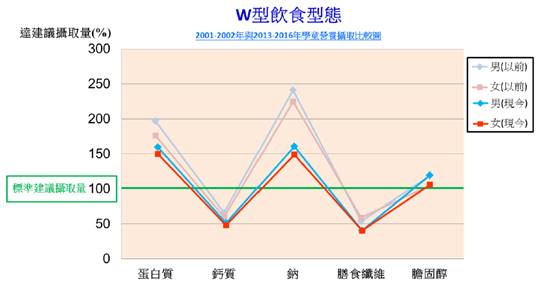 董氏基金會食品營養中心主任許惠玉,分析學童兩次調查間的W型飲食型態,發現孩子們鈣質與膳食纖維攝取不足的問題較過去嚴重(見下圖)。