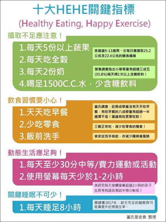 董氏基金會食品營養中心主任許惠玉指出,10大HEHE關鍵指標包含「喝足2份乳品」、「吃早餐」、「天天5蔬果」、「多吃全穀」、「運動超過30分鐘」、「喝足1500 C.C.的水」、「餐前洗手」、「不吃零食」 、「睡足8小時」 、「3C少於1小時」。落實10大HEHE關鍵指標於每一天,就能有效打擊兒童肥胖。