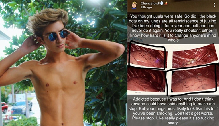 上周公布美國一名18歲大學生Chance Ammirata,16歲開始吸電子煙,結果造成肺塌陷送進加護病房。(圖片來源/當事人twitter及IG、Mail Online)