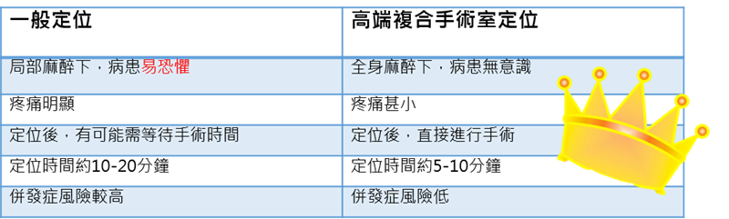然而,現在許多醫院都設有高端複合室手術室,裡面有多軸式機械手臂、精準的導航系統、滑軌式電腦斷層掃瞄儀192切、高品質智能化操作介面,量身訂作不同的掃描參數。病患在全身麻醉下進行,先進行電腦斷層造影,精密算出定位的位置,定位完成後,直接銜接手術,可以減少病患在檢查室、病房至手術室,轉移過程中的風險與等待時間、疼痛度小。(延伸閱讀:得了肺腺癌怎麼辦?一張表搞懂各期療法)