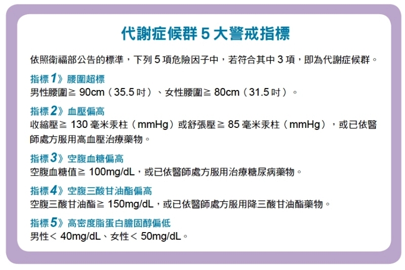 什麼是代謝症候群?對健康有哪些影響?臺中榮民總醫院新陳代謝科主任李奕德解釋,代謝症候群並不是一個特定的疾病,可當作一群容易導致心血管疾病的狀態,醫界發現,如果血壓偏高、空腹血糖偏高、腰圍肥胖、血中三酸甘油酯(triglycerides)偏高、血中高密度脂蛋白膽固醇(High-density lipoprotein cholestero)偏低的五項指標中(表一),符合三項,就是代謝症候群。以血糖為例,正常人的空腹血糖值在100mg/dL以下,當血糖值長期等於或超過126mg/d,就視為糖尿病。若空腹血糖介於100~125mg/dL之間,可認定有風險,但「未達疾病」的病前狀態(也稱糖尿病前期)。只要代謝症候群5大指標符合3項,就代表發生心血管疾病的風險會提高,醫療費用也會提升。在預防勝於治療的前提下,提早篩檢可針對高風險的族群進行健康風險管理,透過改變生活及飲食,減少疾病的發生或惡化。