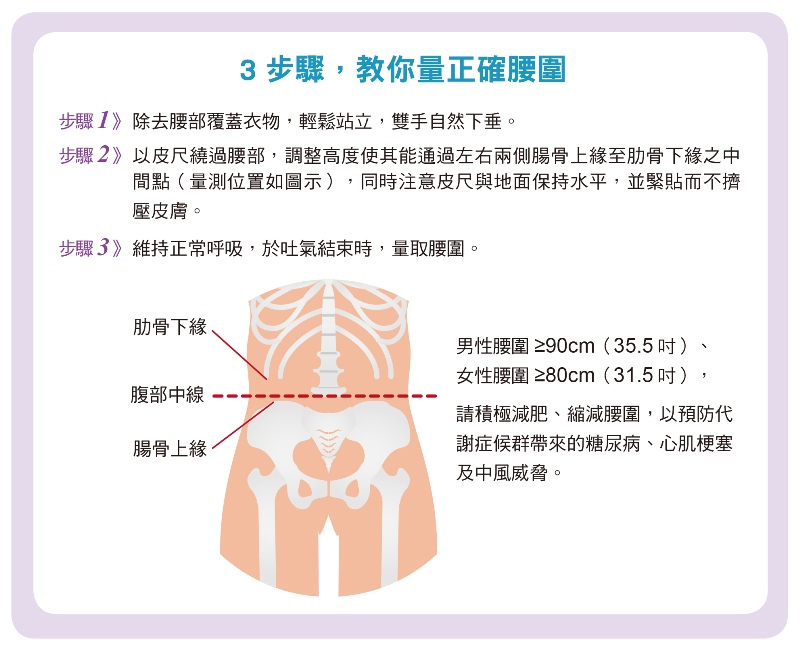 想遠離代謝症候群,就從最簡易判斷的「量腰圍」開始。拿皮尺測量腰圍就可快速篩檢,只要男性腰圍≥90cm(35.5吋)、女性腰圍≥80cm(31.5吋),請積極減肥、縮減腰圍,腰圍一吋、一吋的減少,就會遠離代謝症候群帶來的健康威脅。