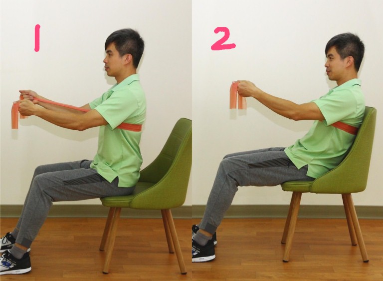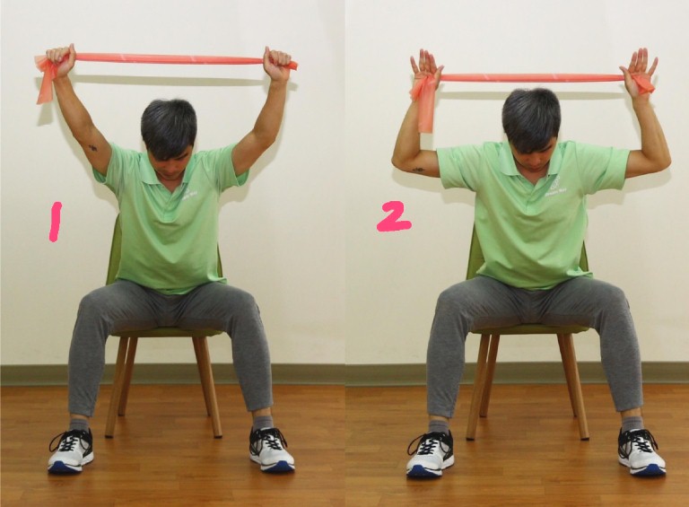 1. (預備動作)坐椅子的前緣,保持背部挺直向前傾,雙手保持在耳朵旁邊,輕鬆將彈力帶拉開。