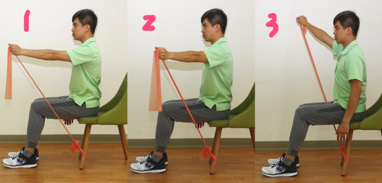 1. (前抬)將彈力帶綁在左邊椅腳,左手抓著向前抬起,保持左手延伸。