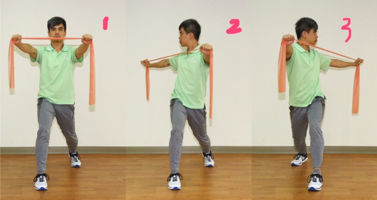 3. (左轉)弓箭步左腳在前,將彈力帶拉開,身體向左轉,保持骨盆穩定不動。