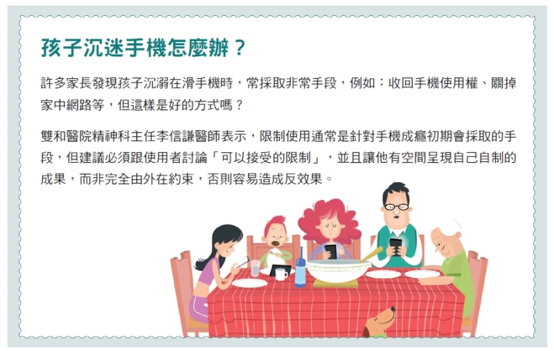 透過學校心理輔導系統的幫助,以及到醫院進行4~6次的家族治療,漸漸的,男孩與父母越來越有話聊,也較能接受對他的手機使用控管,雖然經過半年的努力,仍是重度的手機使用者,但已經能步入正常作息,也大幅改善學習狀況。