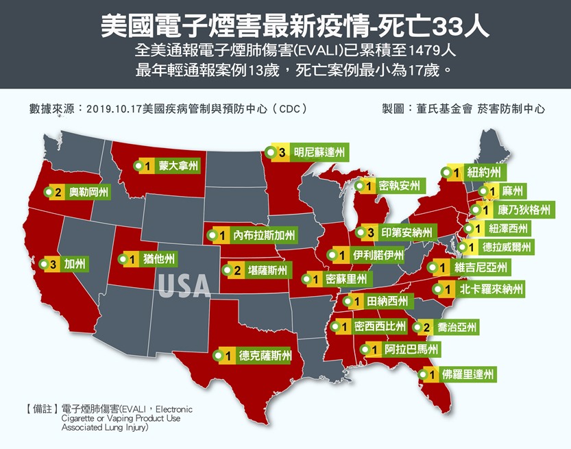 2010年美國「開放成人選擇、禁止青少年使用」的電子煙政策執行後,才短短幾年,已有500萬青少年身陷「電子煙=瘟疫」的泥沼中。自今(2019)年8月美國各州衛生局陸續通報年輕人吸食電子煙傷害事件,包括癲癇、噁心、腹瀉、呼吸急促、肺塌陷、急性嗜伊紅性白血球肺炎等「電子煙肺傷害 (EVALI,Electronic Cigarette or Vaping Product Use Associated Lung Injury)」,多位病況嚴重者被送入加護病房,甚至陷入昏迷,8月底開始傳出死亡案例!根據美國政府10月17日公布的最新疫情資料顯示:全美已有1,479個EVALI通報案例,其中33人死亡,約80%的患者年齡在35歲以下,18歲以下患者也高達15%,最年輕通報患者為13歲,死者最小的是17歲。
