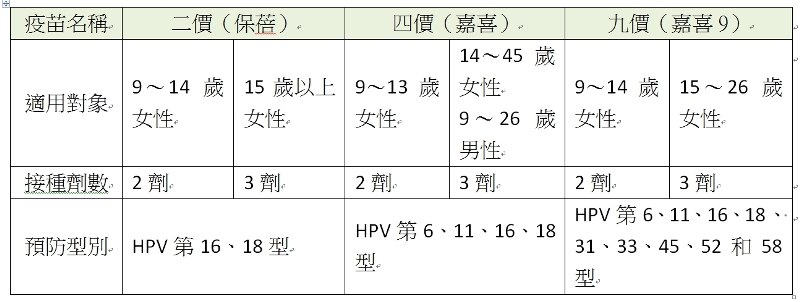 目前市面上有三支疫苗,分別為二價「保蓓」(Cervarix)、四價「嘉喜」(Gardasil)、九價「嘉喜9」(Gardasil 9),也就是可以預防二、四、九種不同類型的HPV病毒,其中二價可以預防16、18型這兩種引發子宮頸癌比率最高的病毒,而四價同時可以預防6、11型。九價除上述四種,還增加了52、58、31、33、45五型,讓其他的癌症風險也降低。