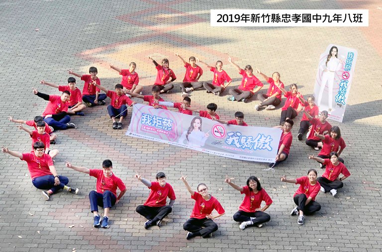 新竹縣忠孝國中九年八班同學擺出跟Jolin一樣潮的手勢,展現拒菸意志。