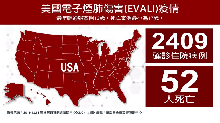 美國今晨再公佈電子煙肺傷害(EVALI)最新疫情,通報確診病例已達2409人、52人死亡,通報案例最年輕為13歲,死亡案例最小的是17歲,其中將近八成的通報患者是35歲以下的青年,而18歲以下的青少年更高達16%。同時,美國也公布最新青少年菸品調查(NYTS),發現超過三成高中生使用菸品,其中使用電子煙的高中生就有27.5%!電子煙已成為青少年使用尼古丁藥物最大宗的族群。