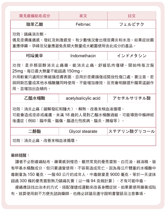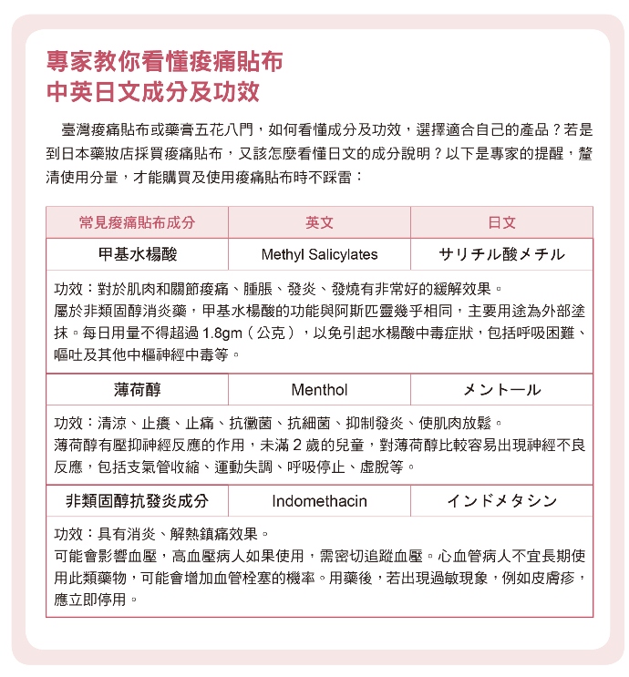 許多民眾會以為貼布不是藥品,哪裡痛,就貼哪裡;其實,能迅速止痛的痠痛貼布,大都含有止痛、消炎成分,這些成分會經由皮膚被人體吸收。輔大醫院藥劑部林申樺藥師強調,除了水楊酸外,市售痠痛貼布最常見成分為「非類固醇消炎藥」,這是藥品,貼太多痠痛貼布,會導致肝腎負擔增加,也有水楊酸累積過多的風險。