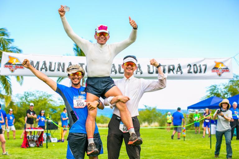 跑極地超馬也許不是很特別,但父子一起跑,可就稀奇了!2017年5月,陳焜耀與兩個兒子成功挑戰夏威夷火山馬拉松,在抵達終點線後,彥誠和彥誌兄弟倆還特地將父親扛在肩上,共譜出賽場上最美的親情風景。(圖片由M2M大會提供)