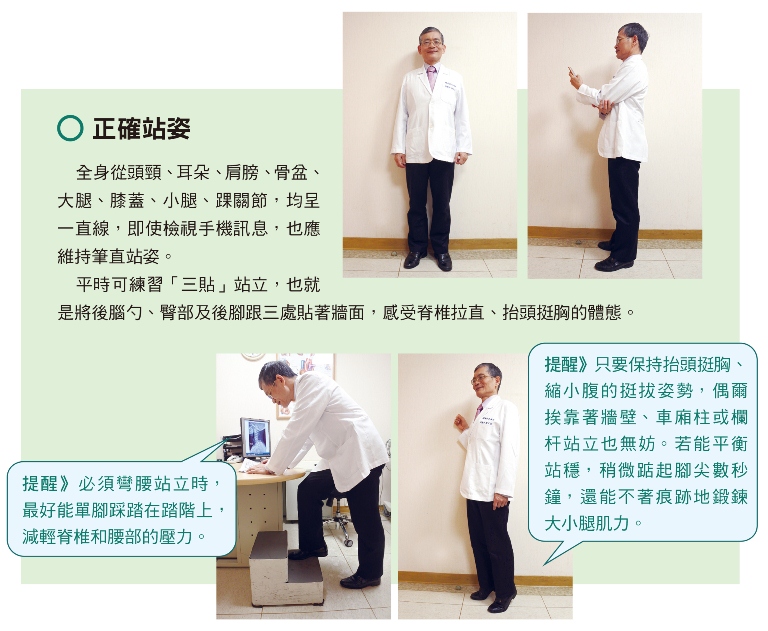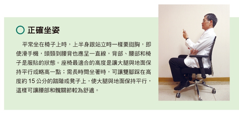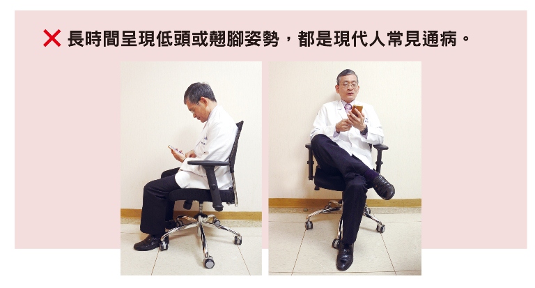 以前老人家常說「坐沒坐相、站沒站相」,說的雖然是一個人的規矩與外在形象不佳,但套用在身體健康,是有意義的。國泰綜合醫院物理治療師簡文仁表示,不正確的姿勢會為人體帶來額外的壓力,壓迫神經、血管,造成血液循環不良,長時間會產生痠痛麻等症狀,更嚴重還會導致筋膜與骨骼變形,例如經常坐著翹二郎腿,可能引發骨盆歪斜;為了看電腦螢幕或電視,頭部常不自覺地長期轉向某一側,可能變成斜頸歪頭、左右兩邊臉不對稱等。想預防痠痛、找回健康,快改掉NG習慣,學著好好坐、好好站吧!(延伸閱讀:「坐」得好可以訓練核心肌群,但怎樣才算是良好坐姿?)